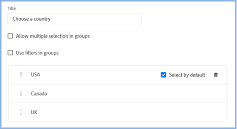 In this example only one group is required and users are only allowed to choose one country so both options below would be cleared. Also the aim is to only show information about one country at a time so Select By Default has been ticked. The default and delete icons are displayed when you hover over a tag name.