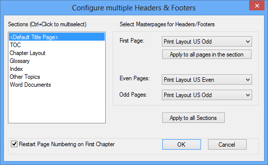 Multiple TOCs, Indexes and Glossaries were introduced in Adobe RoboHelp 7 and Variables were introduced in Adobe RoboHelp 6. Choose the required options here. This TOC will show as the default layout in the next page of the wizard but there is a very important point to note here. Later changes to the TOC will not change the topics in the print layout. More about that when we get to Page Two of the wizard. New in RoboHelp 11 are the Header/Footer buttons. The first time you open the print dialog, the dropdown will be set to Default and that will give you the traditional headers and footers. Click the dropdown to select any other option and that will enable the Multiple Header/Footer button that opens the dialog shown below. As you can see, you can select a First Page, Even Page and Odd Page header and footer. That can be applied to all sections of the document or you can have different settings for each section of the document. What is in each header and footer is defined by the master page selected, as described below. If the master pages have been set up with page numbering you can restart the numbering for the body of the document. Thus the TOC can have Roman numerals and the body can have Arabic numbering.