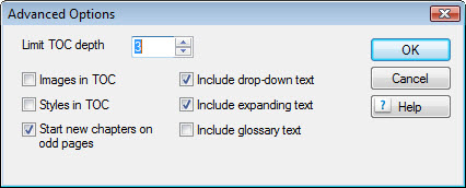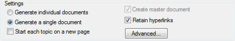 Now you may just want the topics and no chapter but not want them all starting on different pages. Clear the check box here and in the next page of the wizard put all the topics in one chapter. Produce the printed document and then just remove the chapter name in Word. Make sure you tick the Maintain HTML Heading Levels checkbox in the next page of the wizard. Also see Step 4 in Page 2 of the wizard for information about printing topics without chapters. Retain hyperlinksIf you want your online hyperlinks to remain as active links in your Word document, select this option. AdvancedClick the button and define the settings you want.