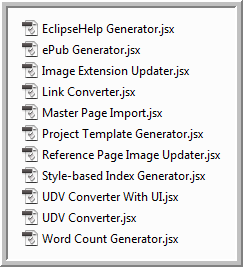 The following scripts are installed with RoboHelp 9. If you don't see any of them in your list of scripts when viewed from Tools > Scripts you need to copy them from your RobHelp installation folder to your profile. Copy the required script(s) from