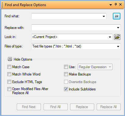 Note that Find and Replace in Files works at HTML code level. That means it can find tags and change them as well, so be careful.