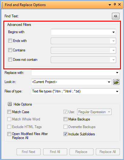 Then you can toggle the Show Options / Hide Options button for additional filters that are self explanatory. If you are not familiar with Regular Expressions, they are arguably the most advanced way of searching so to my mind the option should be in the Advanced Mode. Better still, just show all the options. However, this does not affect the functionality of regular expressions, more on that below.