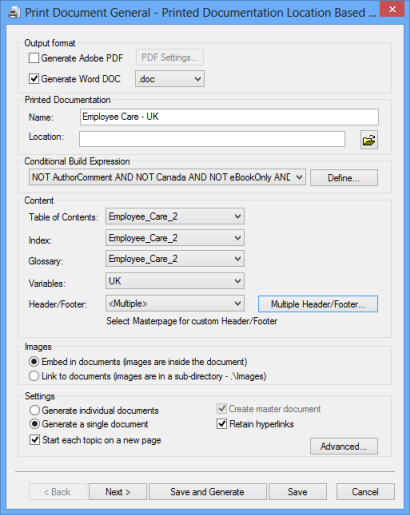 Notwithstanding the trend to online information, many users still require printed documentation. A major change in Adobe RoboHelp 11 is the ability to include your own headers and footers in the printed outputs. You can define which sections have headers and footers. Each section can be different and you can customise the formatting.