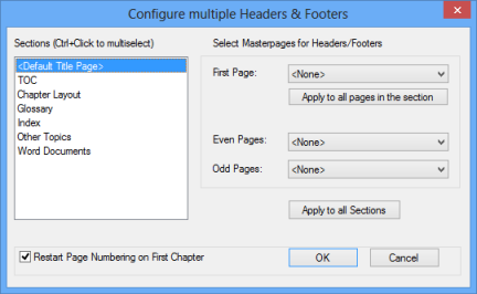 - If you want different headers and footers in different sections, different odd and even pages or you only want to have headers and footers in the content section with nothing on the title page, the table of contents and suchlike, click the Multiple Header/Footer button to access the second dialog below. It is clearly set up so that you can define exactly the options you want.