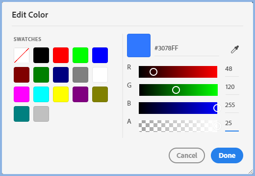 Use the sliders to adjust or set a colour. As you do so, the RGB values will change. Use the A setting to adjust the opacity of the colour.