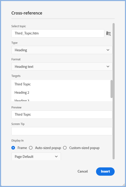 In the Preview field you will see what will be shown in the topic based on the Format option you have selected and you can add a Screen Tip that will be seen when the user hovers the mouse over the cross reference.