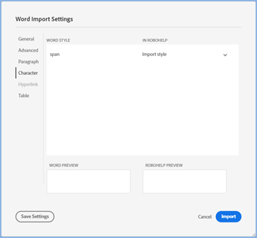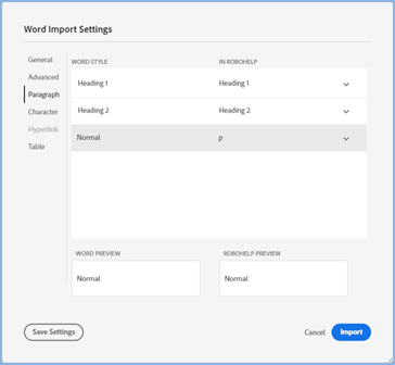 Adobe RoboHelp attempts to automap styles where it can match the name in the Word document with a style in the CSS defined for style mapping. Against each style in Character, Paragraph and Table settings you will see how the styles have been mapped.