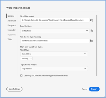 Start New Topic From Style If you want to break your document into a number of topics, set the style(s) to be used here. Click the dropdown and select the styles required. Click to the right of the dropdown to close it. If you want to use the TOC hierarchy in Advanced settings (Add Generated Topics to Table of Contents, you need to split the document using the same styles. Topic Name Pattern Set the Topic Name Pattern if you want something other than the default. Use Only ASCII characters Tick this option if your file names or the styles to be used for setting the Topic Name Pattern have any characters that might cause problems after import. Generally it can be left blank. |