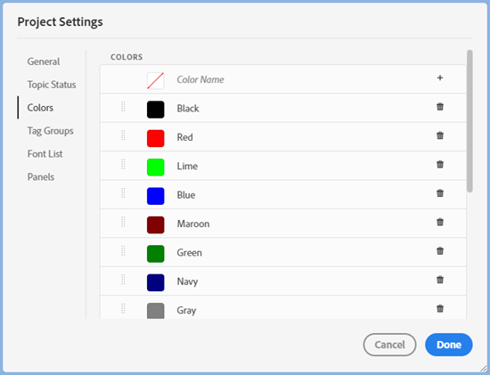 A number of colours are preset. To add a new one, click the icon highlighted above and enter a name, then click the + icon.