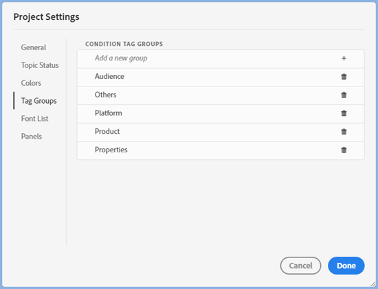 A number of groups are preset. To add a new group, enter the name at the top and click the + icon.