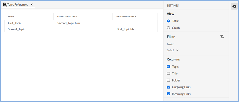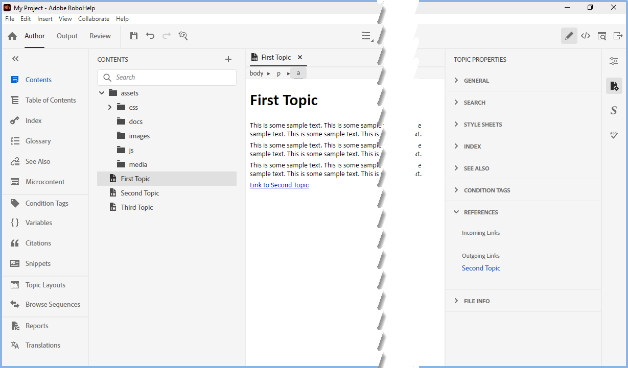 In this topic a link has been created to Second Topic and is shown under Properties > Topic > References > Outgoing Links. Note that the link colour is blue indicating the link is good.