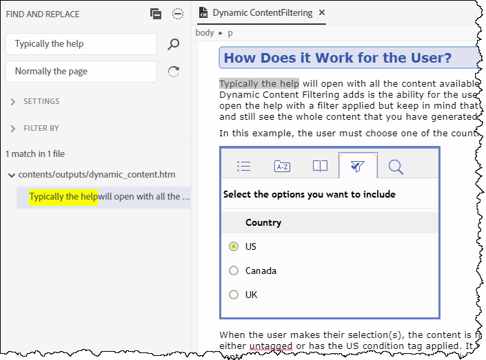 Find / Replace With The Find and Replace With fields can either be text or a regular expression if the Use Regular Expressions check box is selected. In both cases you can widen the fields by widening the whole panel. Backup Options If selected, Backup Modified Files will put a copy of the original file in your .rh folder. If selected, Overwrite Backup Files will delete earlier versions of a specific file so that you only have the last backup. If not selected, then it will accumulate successive versions. Filter By You can choose the options shown. With Topics selected it can also be used in your CSS in Source view.