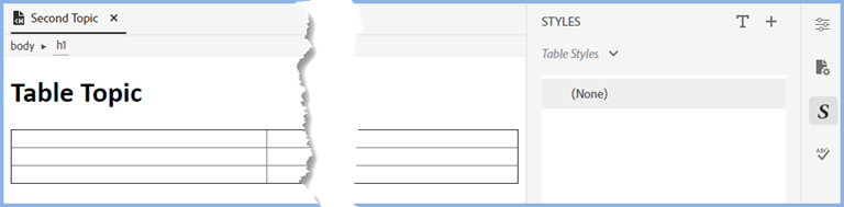 In the screenshot below, a table has been added to a topic using the Insert Table icon in the standard toolbar. The breadcrumbs highlighted can be useful when editing.