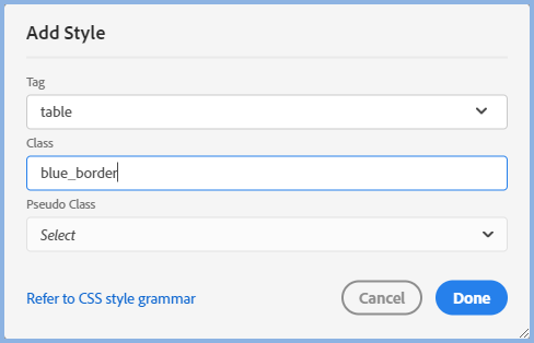 Select table as the tag and enter your name for the table class to be created, in this example it is blue_border.