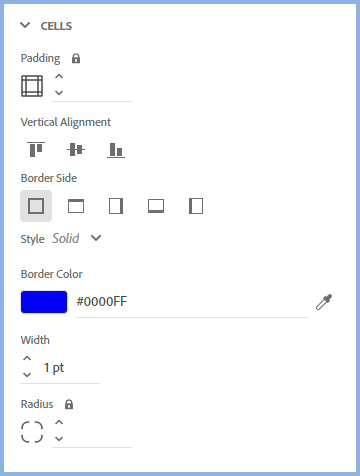 To apply Vertical alignment select a row/column/cell and then go to Content Properties > Font > Vertical Alignment. Select a row, column or multiple cells by dragging the mouse, select a single cell by right clicking selecting Select > Cell. You can also use the breadcrumbs. |