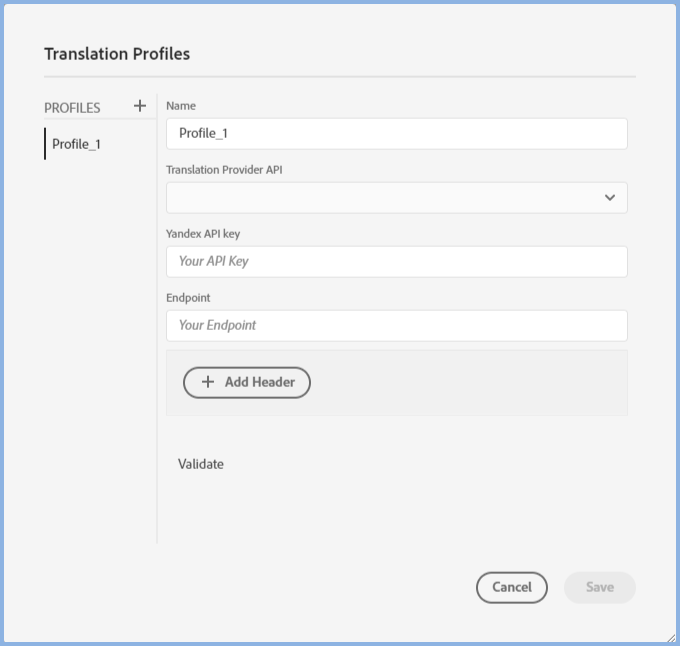 Enter a name for the profile and choose one of the APIs in the dropdown list. There are a number of sites where you can register to use their services in line with their terms and conditions. Yandex Translate is supported but Yandex Cloud Translate (an EU only service) is not supported.