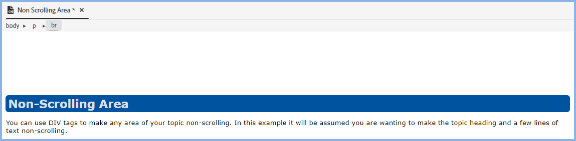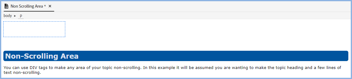 In this example we want the non-scrolling area to be at the top of the screen, accepting topic content will appear above it. Press Enter at the start of the topic heading and create a few blank lines with the P tag applied.