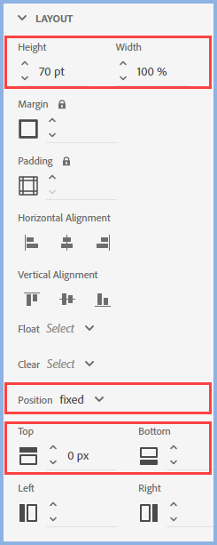 The steps are the same as the top non-scrolling area but this time leave the Top setting blank and define the Bottom setting as 0px. You can change that setting to move the div