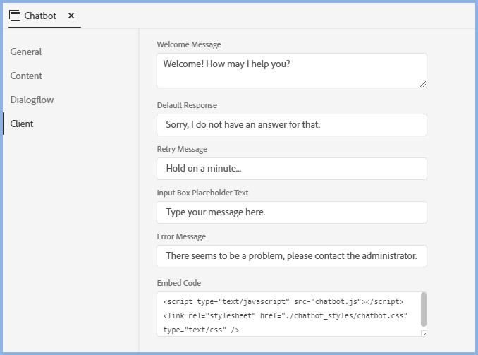 - A Chatbot engine for the Chatbot Client, such as Google's Dialogflow supported by Adobe RoboHelp.