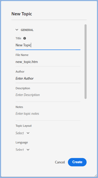 New topics are created by right clicking in the Contents Panel or clicking the + icon and selecting New Topic. Enter the Topic Title and File Name, then in the Properties set up anything else you need to define.
