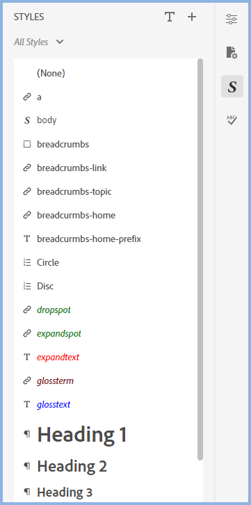 - Depending on what has focus, 4 will display relevant options. In this example the top icon on the right has focus so the Content Properties of whatever has focus in the content are shown. The other icons access the Topic Properties, the Styles, the Spell Check and Track Changes.