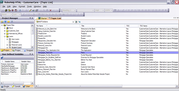 In the screenshot below, the Topic List is in the Document Editing Pad and the User Defined Variables are in the same pod as Single Source Layouts and Conditional Buld Tags.