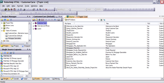 In the Project Manager pod shown below, you can see that three TOCs have been created. Alongside each has been opened in its own pod and the Topic List has been displayed alongside. This enables topics to be added to any or all of the TOCs, pages or books to be copied or moved between topics.