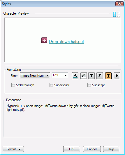 Any dropdown hotspot using the same style sheet will now display twisties in the Preview window or the generated help. The twisty will not appear in the RoboHelp Design Editor nor will it appear in printed documentation. You may take the view that the twisty would not work in a printed document (true) but you might also want the printed document to show your help as it appears online.