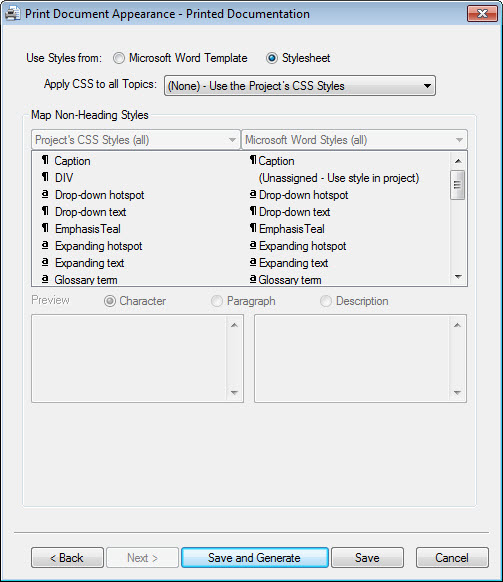 - If you select "None - Use the Project's CSS Styles" your printed output will print with the same fonts, font sizes, colours and so on as in the online help. Whether or not that looks good will depend on the CSS file(s) used.