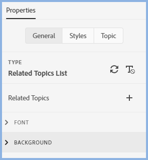 To link topics place the cursor next to Topic List and go to Properties > General. Click the + icon next to Related Topics to select the topics you want users to see.