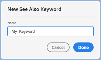 When you click Done, the keyword will be listed. Click the > icon to show Linked Topics and Used In Topics.