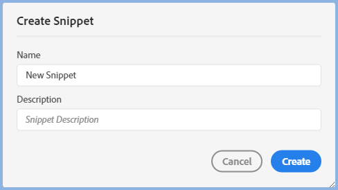 - Set the fields as required and click Create to open a blank Snippet in the Design Editor.