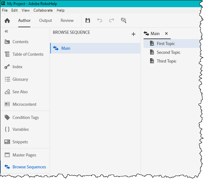 If some of your outputs only include some of the topics in the browse sequence, Adobe RoboHelp will automatically exclude the topics not in the output.