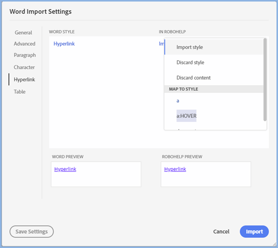 Hyperlinks can be imported or mapped to an existing hyperlink style in your CSS.