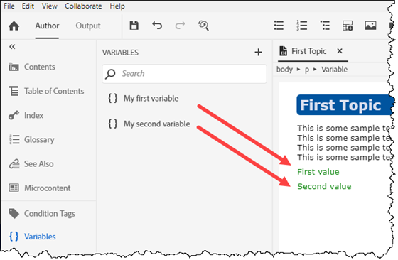 Variables allow you to enter a string that can be inserted in topics, topic titles, master pages, snippets, index entries and a table of contents. They are used where the string could change in the future. Company and product names are good examples. Instead of having to edit every place the company or product name is used, you insert a variable. When the value of that variable changes, you change it once and it cascades to wherever you have used it.