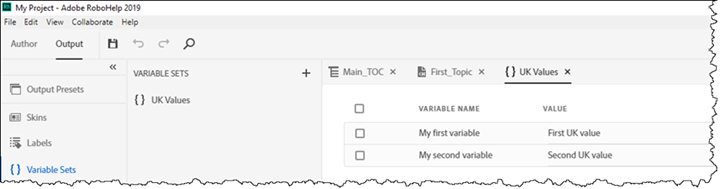 Let's say the default values are for US users, in Output mode you click Variable Sets and click the + icon to create say UK Values. All the variables you have created will be listed and you can apply the UK values.