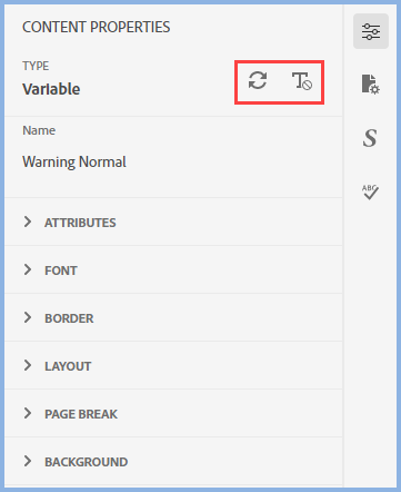You can use the left icon to update the appearance of the variable by clicking the first icon and you can clear any formatting you have applied to this instance of the variable by clicking the second icon.