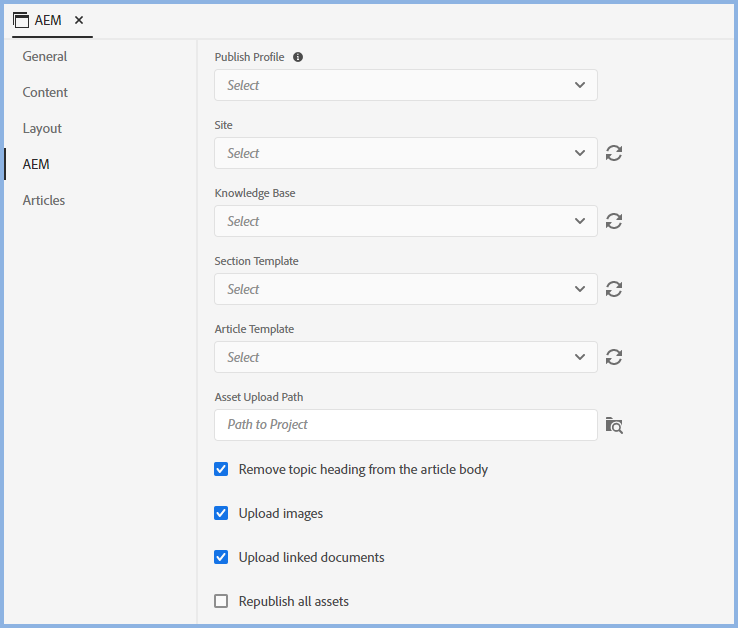 Article Template - Select the AEM template to be applied to the articles that are about to be published.