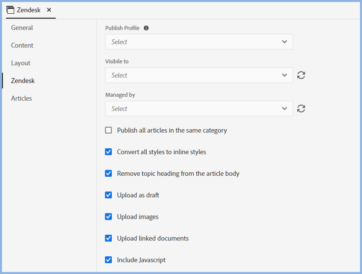 Remove Topic Heading from the Article Body - Removes the topic title if styled as H1 in the topic body. The title of the topic is available as part of template so if this option is not selected, two titles will appear in the published article