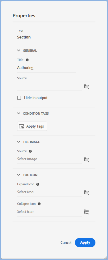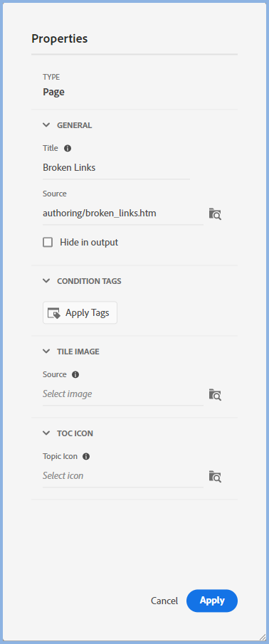 - If you want to restore either to the original names, delete the contents of the title field and click Apply. The titles in Topic Properties and Content Properties will again be in sync.