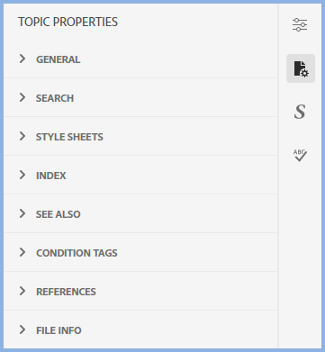 4. Depending on what has focus, 4 will display relevant options. In this example the top icon on the right has focus so the Content Properties of whatever has focus in the content are shown. The other icons access the Topic Properties, the Styles and the Spell Check. Clicking one of the icons a second time hides the right panel.
