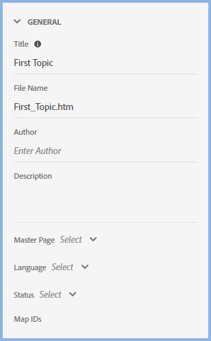 This is also where you can apply a master page to your topics, the language to be used, the topic status and any map ids.