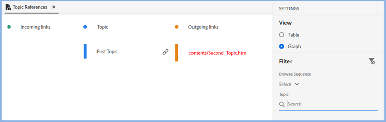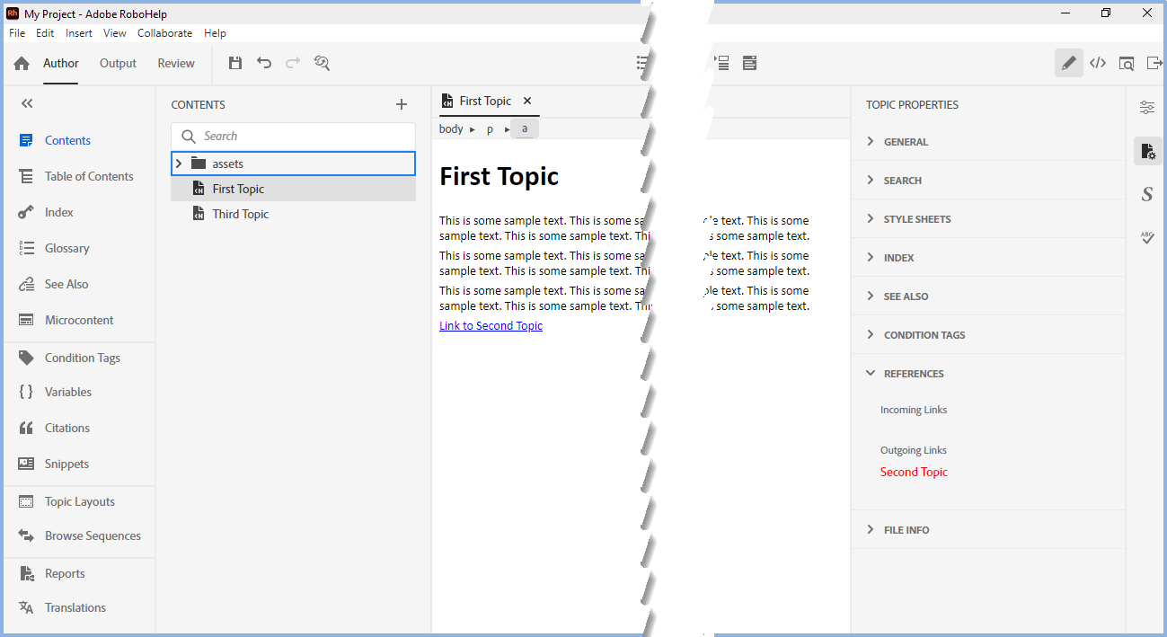 In this topic a link has been created to Second Topic and is shown under Properties > Topic > References > Outgoing Links. Note that the link colour is blue indicating the link is good.