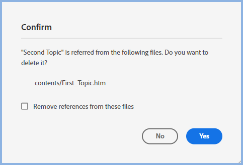- Click No and in Properties > Topic > Reference review the incoming links that will be broken.