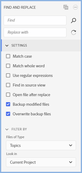Find / Replace With The Find and Replace With fields can either be text or a regular expression if the Use Regular Expressions check box is selected. In both cases you can widen the fields by widening the whole panel. Backup Options If selected, Backup Modified Files will put a copy of the original file in your .rh folder. If selected, Overwrite Backup Files will delete earlier versions of a specific file so that you only have the last backup. If not selected, then it will accumulate successive versions. Filter By You can choose the options shown. With Topics selected it can also be used in your CSS in Source view.