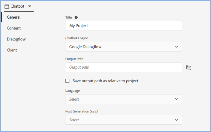 If your chosen Chatbot Engine is not supported by Adobe RoboHelp, you can use the Microhelp preset to create either JSON or XML files and upload those manually.