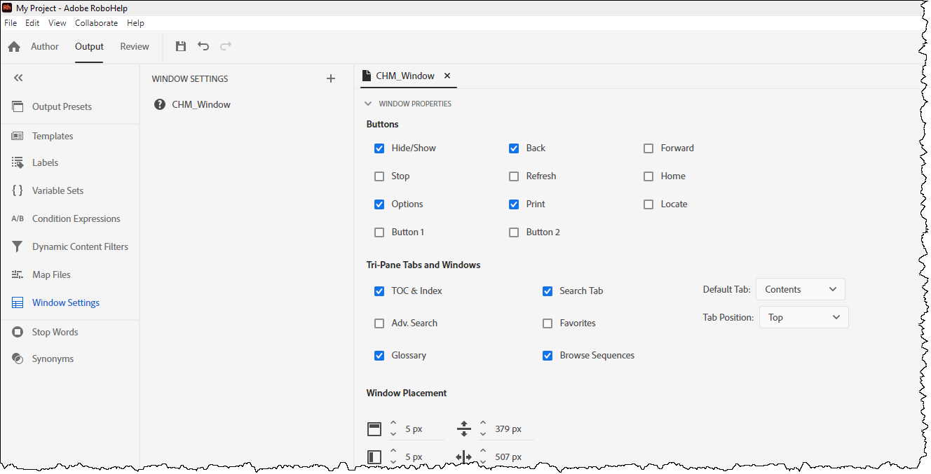 To create or edit the window for Microsoft HTML Help (CHMs), click Outputs and select Window Settings.