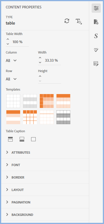 - Depending on what has focus, 4 will display relevant options. In this example the top icon on the right has focus so the Content Properties of whatever has focus in the content are shown. The other icons access the Topic Properties, the Styles, the Spell Check and Track Changes.