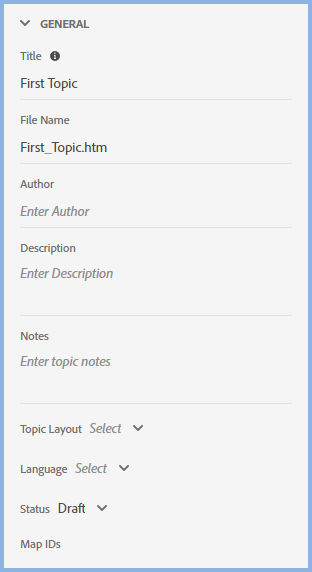 General The General properties are grouped here. The Description field expands automatically for longer content. The content of the Description area can be used in the search metadata, in cross references or it can be used for your own notes. However, for Notes there is now a better option. If you used the field for your own notes it was important not to select the Search > Topic Description radio button in your preset as your notes would end up in the output. That could be awkward! The option remains for legacy reasons but now there is a separate Notes field that will not be generated in any output. This is also where you can apply a topic layout to your topics, the language to be used, the topic status and any map ids. |