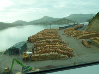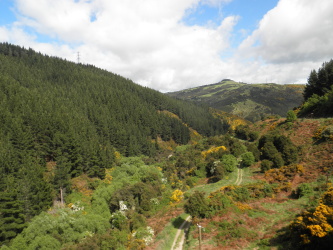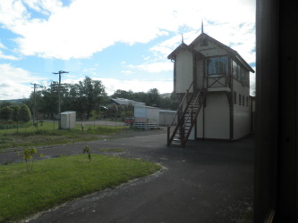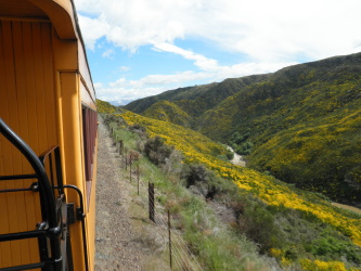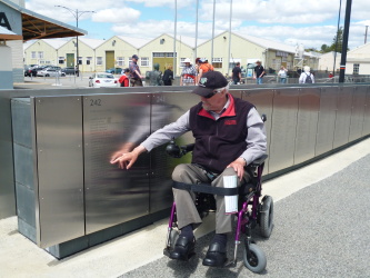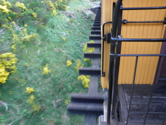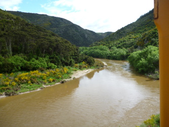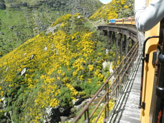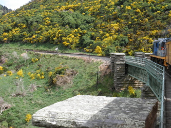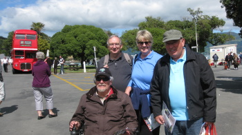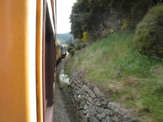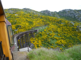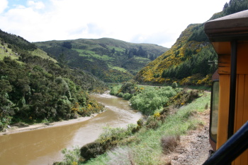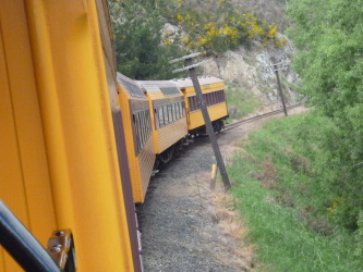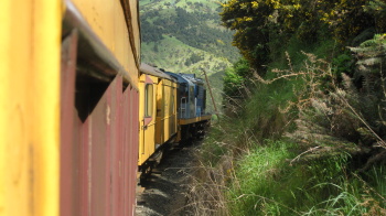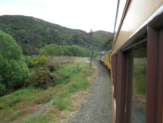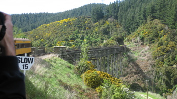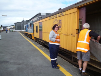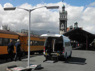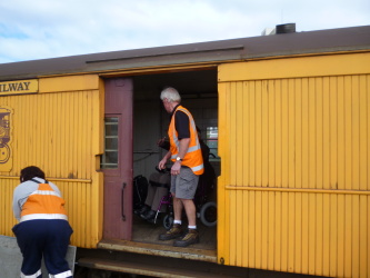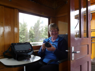 Our taxi driver Annette was very good at getting Malcolm on board and secured and got us to Dunedin Station in plenty of time for the Taieri Gorge Railway trip that we had booked direct rather than through the ship. She was even happy to waive payment until the return so that we were free to choose paying in cash or by card. We had understood Malcolm would not be able to come on the train as the ship's tour had commandeered the only accessible carriage. We had not counted on the determination of one lady member of staff who went to great lengths for us. She found a couple of men and a couple of strong girls who first of all tried to use various ramps to get Malcolm in the goods wagon as it did have a window. None were quite right so they physically lifted the chair and Malcolm in! Then of course Health and Safety reared its ugly head and someone ruled that passengers could not travel in this wagon. Not to be deterred, it was then decided that we were going to have to resort to a previously discounted solution and lift Malcolm into a special narrow chair. The staff of the Taieri Gorge Railway were just amazing and we are most grateful for the lengths they went to for us. It was tiring for Malcolm being moved in this way but he did enjoy the day and was glad he could stay with us. When we returned, Annette had got the taxi on the platform almost alongside our carriage and after the railway staff had got Malcolm off the train, they and Annette got him back into his chair.